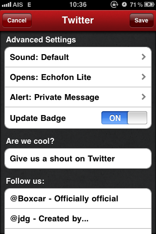 เด้งแล้วให้เปิด Echofon ซะ ส่วนการเตือน ให้แจ้งแบบ Private แค่บอกว่า new mention, new direct message เพื่อความเป็นส่วนตัวของเรา บางทีวางมือถือไว้บนโต๊ะทำงาน เดินออกไปคุยงาน ข้อความเราจะยังไม่แสดงบน Badge