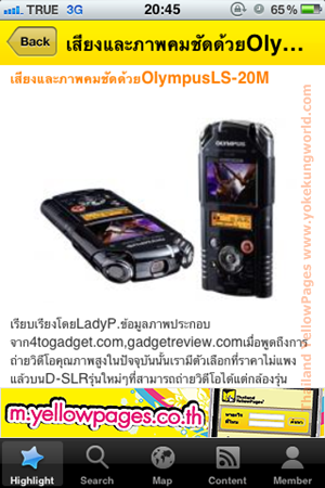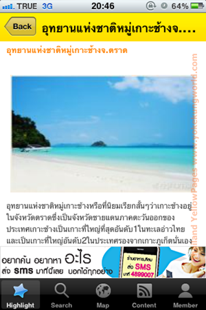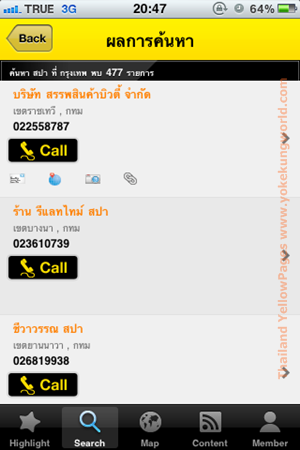 สำหรับเมนูของแอพ Thailand YellowPages นั้น จะมี 5 แท็ป คือ Highlight, Search, Map, Content, Member