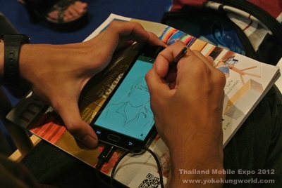 หลังจบงานแถลงข่าว ลองเดินสำรวจด้านหน้า Plenary Hall พบบูธ Samsung it’s my Writer project มีศิลปินวาดภาพบน Samsung Galaxy Note