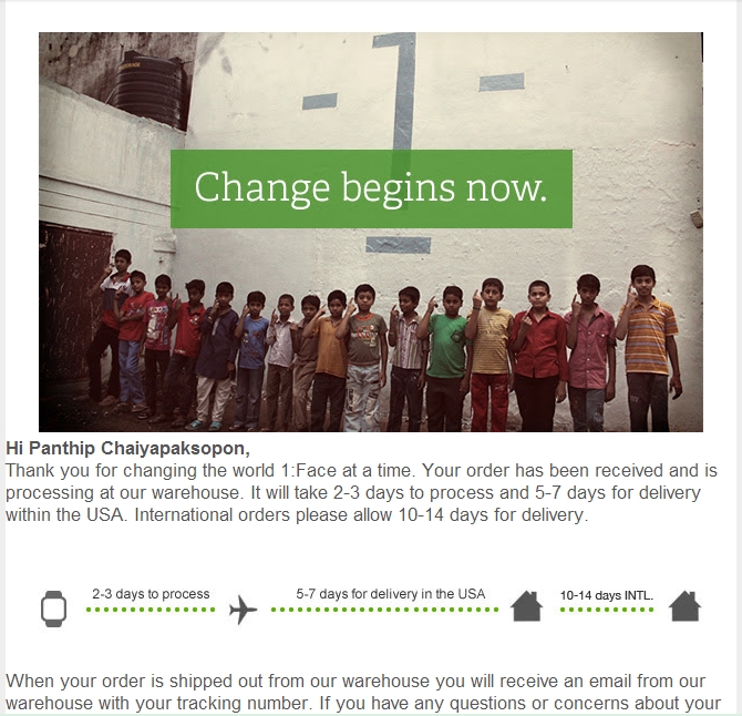 ในอีเมล์เวลาเราสั่งจากเว็บ จะบอกเลยว่ากี่วันถึงบ้านเรา 2 – 3 วัน process 5 – 7 วันส่งใน USA และ 10 – 14 วัน ส่งทั่วโลก โดยจะมีอีเมล์แจ้งสถานะการจัดส่งให้เรา