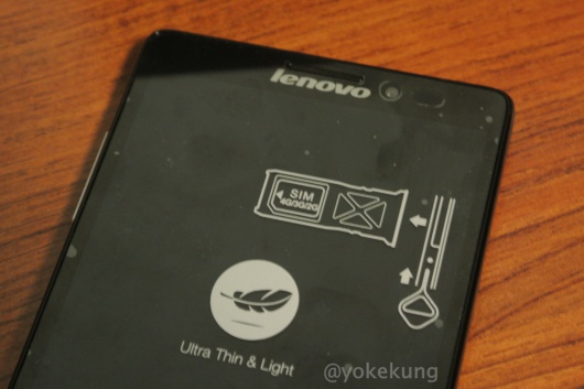 ถาดใส่ซิมจะอยู่ด้านข้างขวา (รุ่นนี้แกะฝาหลังและแกะแบตออกไม่ได้) Lenovo K910L ใช้ซิมการ์ดแบบ Micro SIM แต่ขอบอกว่า ถาดใส่ซิม ยาวมากกกกกกก