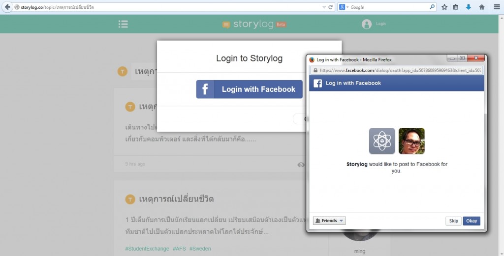 ผมก็ลองถือโอกาสสมัครซะเลย เข้าไปที่ http://storylog.co/ โดยใช้ล็อกอิน Facebook จัดการสมัครสมาชิกให้เรียบร้อย