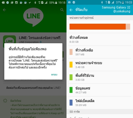 อย่างในภาพ ผมไม่สามารถอัพเดต LINE ได้ เพราะเนื้อที่จัดเก็บข้อมูลไม่เพียงพอ ดูในระบบจะเห็นว่า เราใช้ถ่ายภาพเยอะมาก ใช้ถ่ายวีดีโอด้วย จัดการหน่วยความจำ และเพิ่ม Micro SD ช่วยได้ครับ