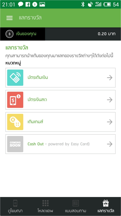 สำหรับของรางวัล เช่นบัตรเติมเงินมือถือ มีให้เลือก 10 – 60 บาท โดยใช้เงินในแอพ +2 บาท เช่น เติม 10 บาท ใช้เงินในแอพ 12 บาท ความเจ๋งคือ บัตรเงินสด มีบัตร LINE Prapaid Card สะสมแล้วเอาไว้เติมเพื่อซื้อ Sticker, ไอเทมเกม ได้เลย (100 – 300 บาท ใช้เงิน +2 บาทเช่นกัน) นอกจากนี้ยังมี บัตรเติมเกม ส่วน Cash Out ถอนเงินผ่าน Easy Card ยังใช้งานไม่ได้ในเวอร์ชั่นนี้