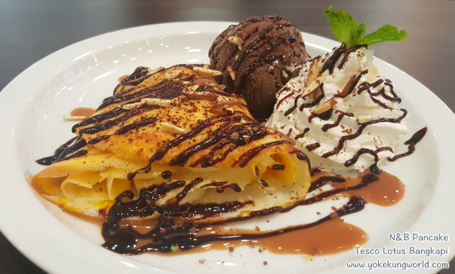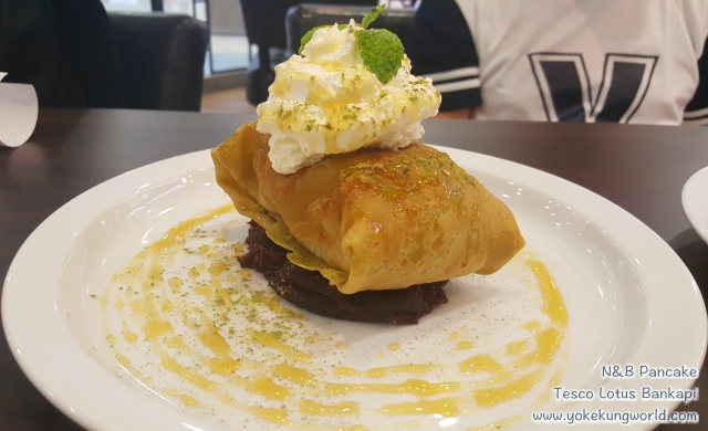 นานแล้วที่เราไม่ค่อยได้มาแถวบางกะปิ (เมื่อก่อนอยู่รามอินทรา มาเดินเล่นแถวบางกะปิบ่อย) มาที่ Tesco Lotus บางกะปิ เยื้องกับเดอะมอลล์ บางกะปิ พอดีนลินอยากกินไอศครีม แล้วเราก็อยากหาขนมทานเล่นด้วย ตอนเดินผ่าน ภรรยาบอกว่า คุ้นๆ โลโก้แฮะ เคยกินน้ำมะนาวผสมน้ำผึ้ง อร่อยดี ก็เลยแวะ N&B Pancake ร้านตั้งอยู่ที่ ชั้น 2 ตรงข้ามร้าน Levi ‘s