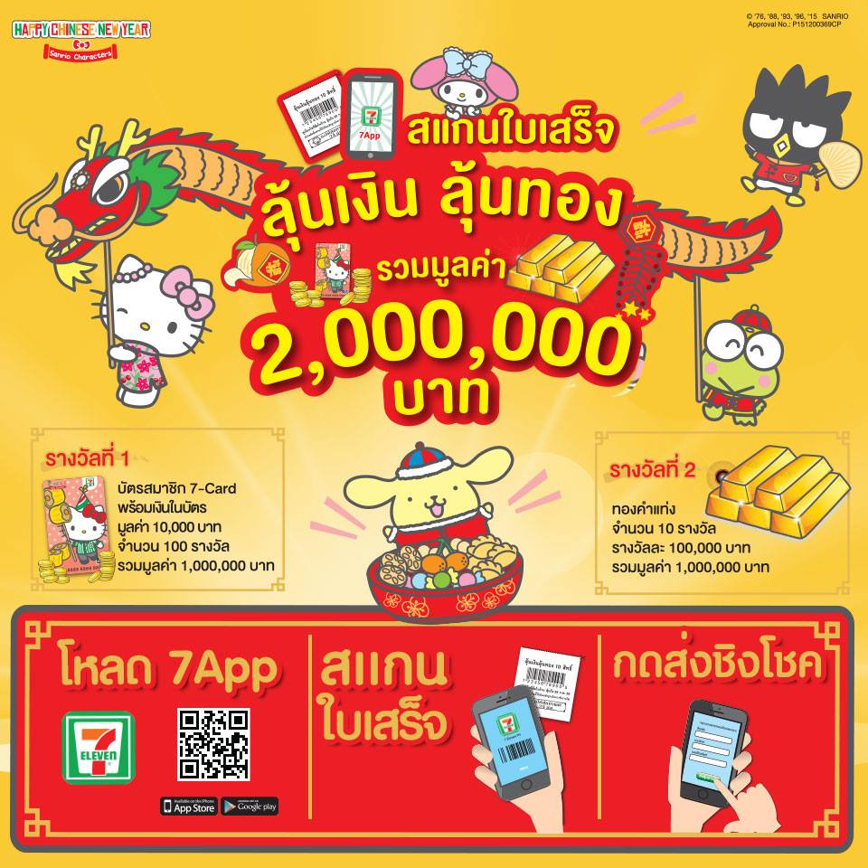 นอกจากอั่งเปาแล้ว ยังใช้แอพ 7App สแกนใบเสร็จ ลุ้นเงิน ลุ้นทอง มูลค่ารวม 2,000,000 บาท รางวัลที่ 1 คือบัตร 7-Card + 10,000 บาทในบัตร 100 รางวัล แจกเยอะซะด้วย รางวัลที่ 2 ทองคำแท่ง 10 รางวัล มูลค่ารวมก็ 2 ล้าน รายละเอียด
