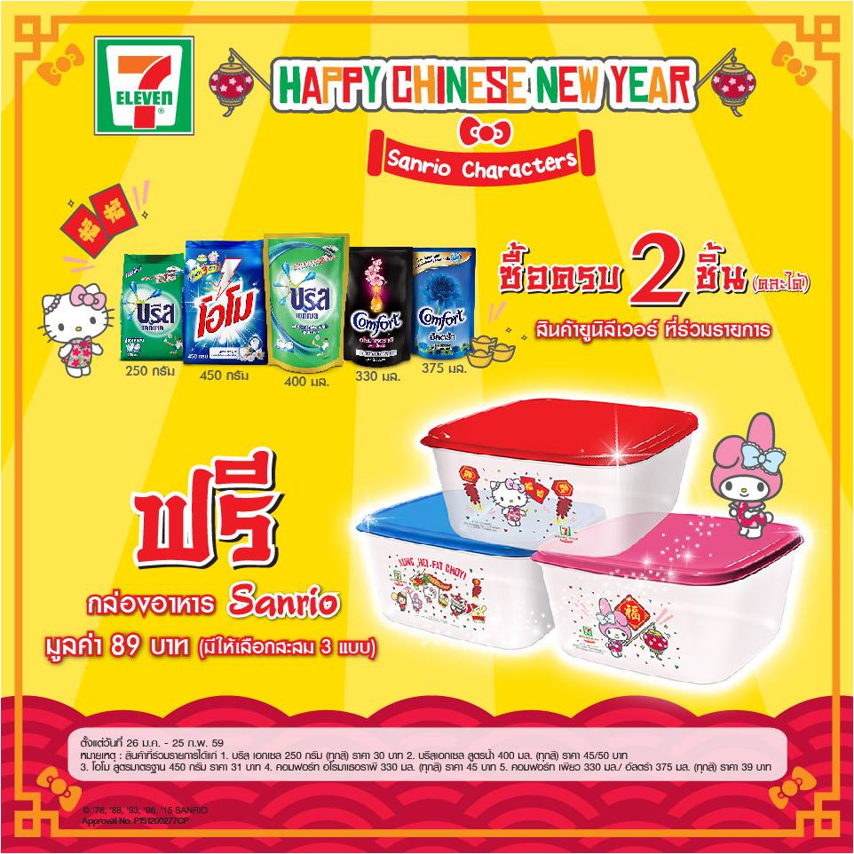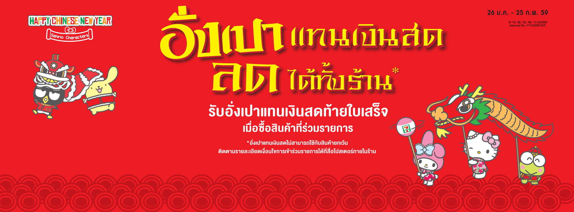 สำหรับอั่งเปาท้ายใบเสร็จ จะได้รับเมื่อซื้อสินค้าที่ร่วมรายการที่ 7-Eleven ระหว่างวันที่ 26 มกราคม – 25 กุมภาพันธ์ 2559 (ยกเว้นบางสาขาที่ไม่ร่วมรายการ)