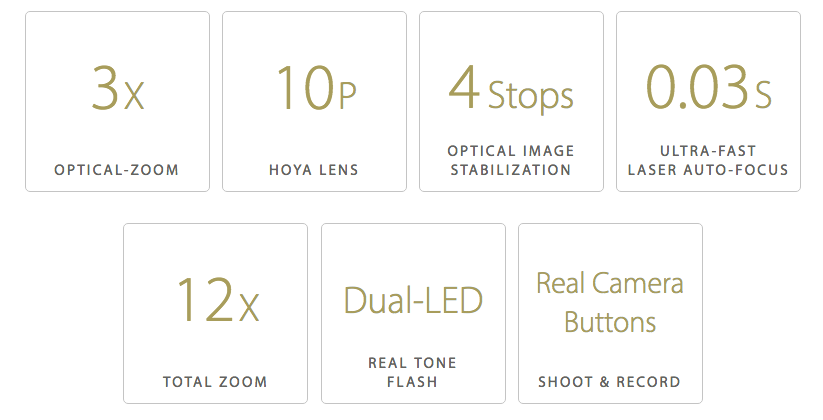 มีปุ่ม W / T หรือซูมเข้า – ออก เพื่อขยายภาพ มีปุ่ม Shutter ให้กดถ่ายภาพได้เลย ปุ่มกล้อง (ชัตเตอร์) กดค้างในหน้าจอ สแตนบาย เข้ากล้องได้ทันที ด้านหลังเป็นกล้อง มีวงกลมล้อมรอบ มีลาย (เป็นหนังแท้) ให้จับถนัดมือ สังเกตว่ามีกริบให้จับด้วย