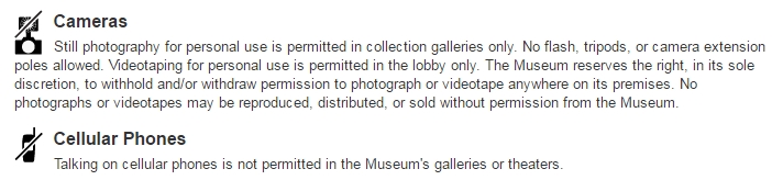จริงๆจากที่เขาบอก ไม่ได้ห้ามถ่ายรูปนะครับ แต่เขาให้ถ่ายด้วยกล้องดิจิตอลได้ ห้ามใช้แฟลช และไม่ควรใช้กล้องมือถือถ่าย ผมเจอรปภ.มายืนบอก คนที่ถ่ายด้วยกล้องมือถือว่า อย่าถ่ายกล้องมือถือ เค้าคงกลัวเราเข้าใกล้ผลงานมากเกินไป และห้ามใช้ขาตั้งกล้อง นอกจากนี้ควรเดินด้วยความระมัดระวัง อย่าให้สายคล้องกล้องไปโดนผลงานใดๆ