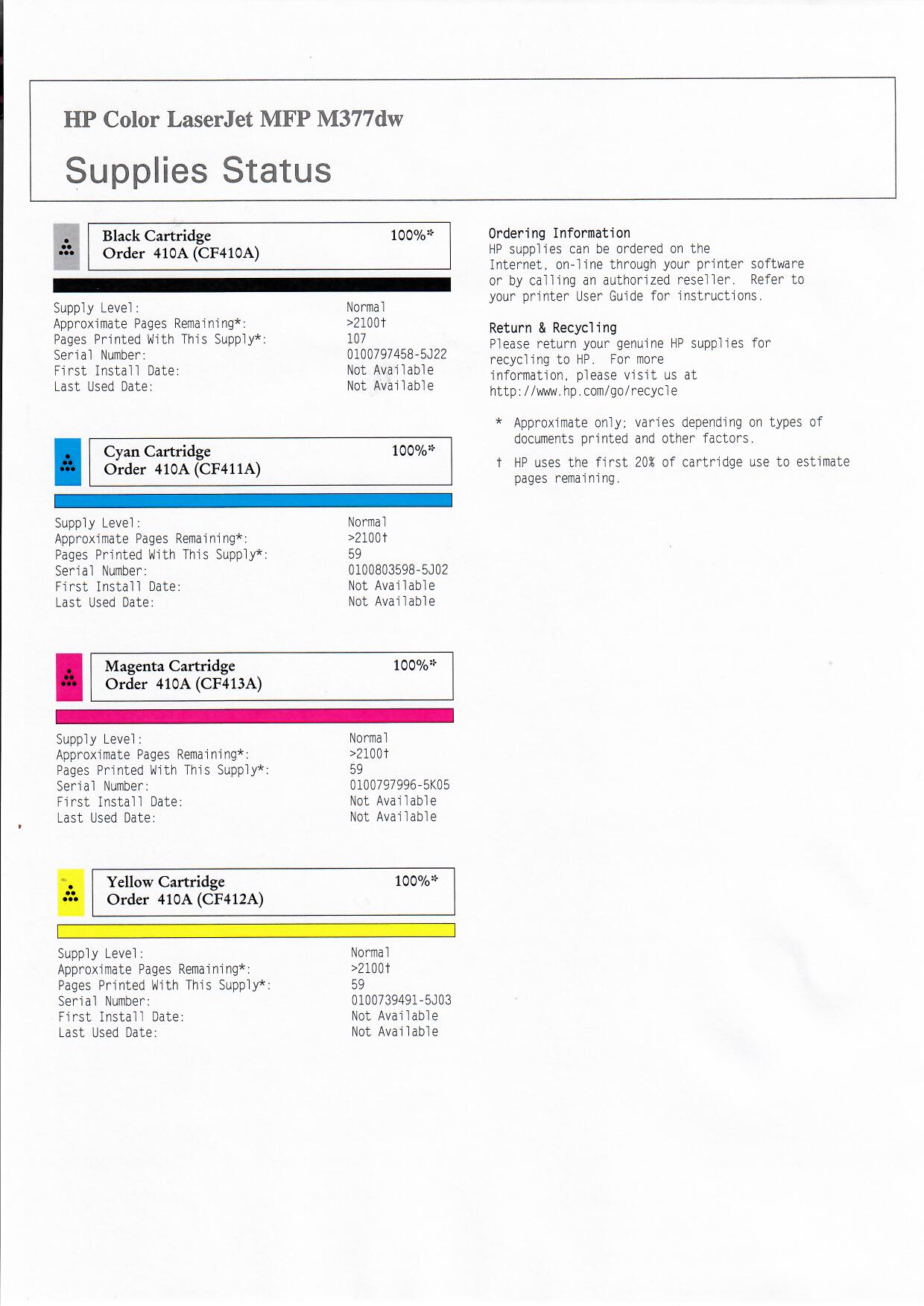 เป็นเมนู เอาไว้ดู ปริมาณหมึก แต่เรากดสั่ง print รายงานออกมาได้ ผมสแกนมาให้ดู เครื่องนี้เป็นเครื่องทดสอบ พิมพ์สีดำไป 107 แผ่น สีฟ้า ชมพู เหลือง อย่างละ 59 แผ่น แต่ละหมึก แยกสี พิมพ์ได้ 2,100+ แผ่น ทุกสียัง 100%