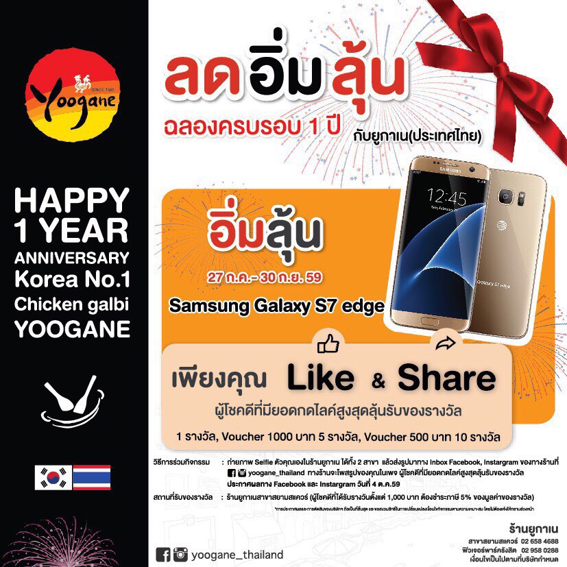 ฉลองครบรอบ 1 ปี YooganeThailand มีโปรโมชั่น กิจกรรม ลุ้น Samsung Galaxy S7 edge ถ่ายภาพตัวคุณเองในร้าน (ได้ทั้ง 2 สาขา) แล้วส่งรูปมาทาง inbox FB/IG ของทางร้าน ทางร้านจะโพสรูปของคุณในเพจ และชวนเพื่อนๆมากดไลท์ในเพจ ถ้าคุณมียอด like สูงสุด (ในเพจ Yoogane Thailand) ได้ลุ้นรางวัล S7 edge / Voucher 500 & 1,000 บาท วันนี้ – 30 กันยายนนี้ อ่านกติกาในเงื่อนไข อิ่มลุ้น ในเพจครับ