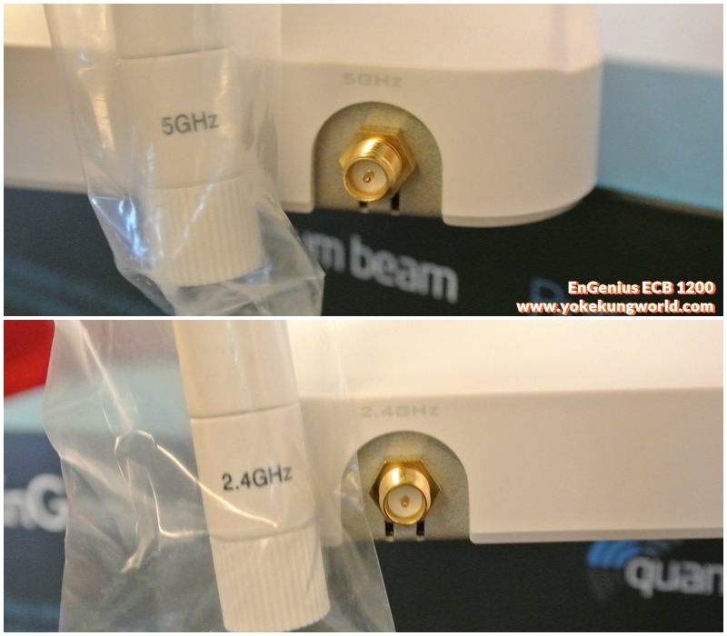 EnGenius ECB1200 รองรับทั้ง 2.4GHz และ 5GHz มีเสา 2.4GHz 2 เสา และ 5GHz 2 เสา เสียบให้ตรงรู มีสกรีนบอกไว้