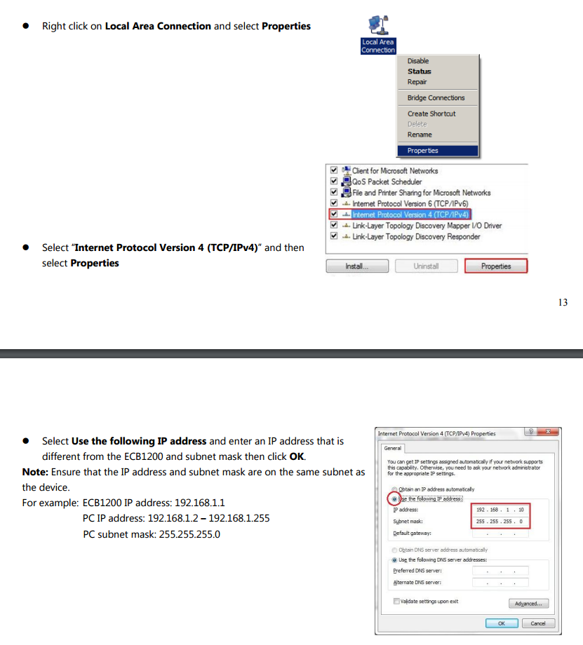 สำหรับการตั้งค่าครั้งแรก ให้ต่อสายแลนจาก EnGenius ECB1200 เข้าคอมพิวเตอร์ตรงๆเลย เพราะเราไม่ได้ใช้เน็ตตอนนี้ แต่เป็นการเข้าไปตั้งค่า EnGenius ECB1200 ผ่าน Browser โดยกำหนดค่า Network Connection เลือกกำหนดตรงส่วน IPv4 เป็น 192.168.1.10 (บน Windows) ถ้าบน Mac อ่านคู่มือ