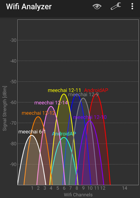 จากประโยคข้างบนนี้ ยิ่งทำให้เราตระหนักว่า เฮ้ย อุปกรณ์ตอนนี้ เยอะแยะ ทั้งฝั่ง เร้าเตอร์ และ Access Point รวมทั้งฝั่งอุปกรณ์ที่ส่วนใหญ่ มักจะรองรับ Wi-Fi 2.4GHz ถ้าดูแชนแนลสัญญาณ Wi-Fi จะเห็นความวุ่นวายมาก บางครั้งไม่ใช่เน็ตไม่ดี แต่สัญญาณคลื่นมันชนกันก็เลยทำให้เกิดสัญญาณรบกวน หรือทับกัน ดังภาพ