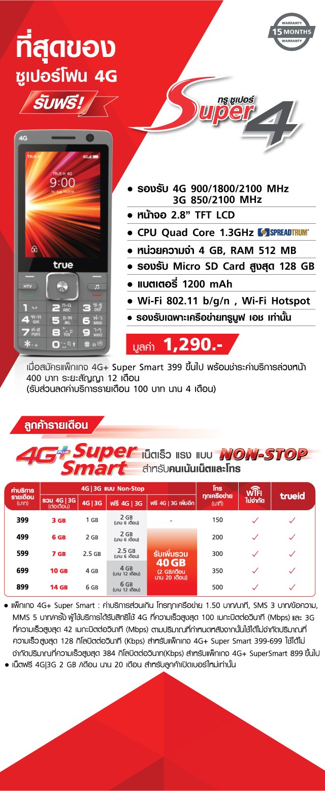 โปรโมชั่นน่าสนใจตรงนี้ >> รับฟรี True Super 4 เมื่อสมัครแพ็กเกจ 4G+ Super Smart 399 ขึ้นไป พร้อมชำระค่าบริการล่วงหน้า 400 บาท สัญญา 12 เดือน โดย 400 ที่จ่ายไปก็เอามาเป็นส่วนลดค่าบริการรายเดือนได้ 100 บาท นาน 4 เดือน)