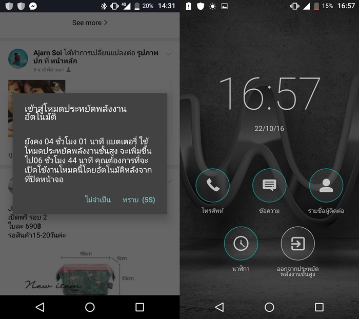 สังเกตว่า 15% นี่แบตขึ้นขีดแดงแล้ว โดยโหมดประหยัดพลังงาน จะใช้โทรศัพท์ SMS รายชื่อผู้ติดต่อ นาฬิกา ได้ เรียกว่าใช้งานขั้นพื้นฐานเหมือนฟีเจอร์โฟนนั่นเอง