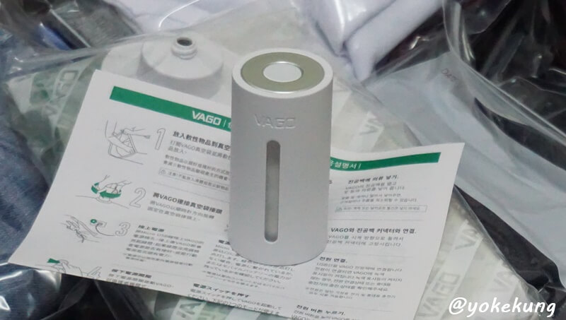หลักการของเจ้าอุปกรณ์ VAGO นี้ก็คือ เป็นตัวดูดอากาศออกจากถุงใส่เสื้อผ้า ทำให้แบน เมื่อแบนก็จะมีเนื้อที่เก็บของ จุของได้มากขึ้น