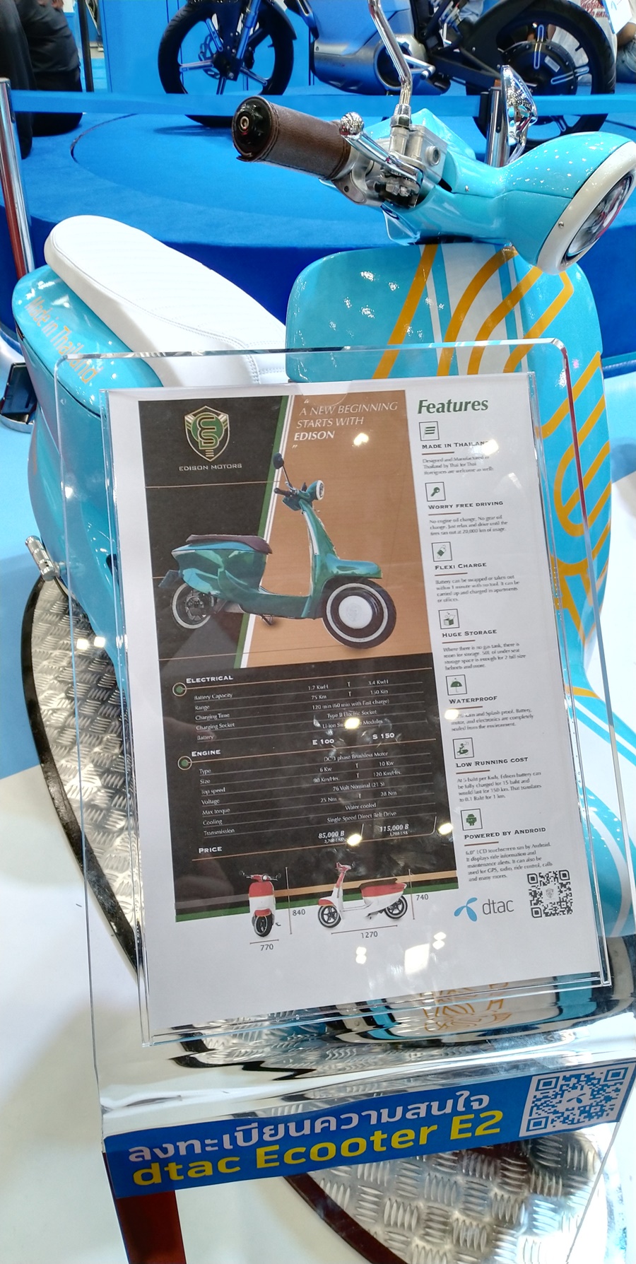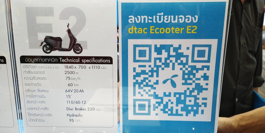 แพลตฟอร์มรถจักรยานยนต์ไฟฟ้า EV Connectivity Platform จากดีแทค เป็นบูธที่ผมตั้งใจมาดูมากๆ สำหรับงานนี้ dtac E2 เป็น EV Scooter ไฟฟ้าครับ เปิดให้จองในงาน รับรถได้เดือนกรกฎาคมนี้ ราคาเริ่มต้น 85,000 บาท (จากเจ้าหน้าที่ที่บูธบอกนะครับ)