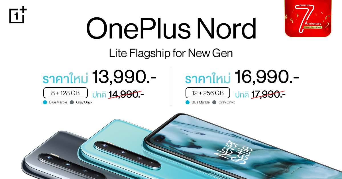 OnePlus Nord – Lite Flagship for New Gen คุณภาพในระดับเรือธง มาพร้อมดีไซน์ที่ออกแบบมาให้จับถนัดมือ กับหน้าจอแบบ Fluid Display ขนาด 6.44 นิ้ว และค่า Refresh rate 90 Hz กล้องหลัง 4 ตัว ความคมชัดสูงสุด 48 MP และครั้งแรกของทาง OnePlus ด้วยกล้องหน้าคู่คมชัดสูงสุดที่ 32 MP สามารถบันทึกวิดีโอความชัดสูงสุดที่ 4K 60fps พร้อมมอบประสบการณ์การใช้งานที่ลื่นไหล เร็วแรงกับสเปคภายใน Qualcomm Snapdragon 765G บนระบบปฏิบัติการ OxygenOS ความจุแบตเตอรี่ 4,115 mAh และเทคโนโลยีชาร์จเร็ว Warp Charge 30T ที่สามารถชาร์จแบตเตอรี่ได้ 70% ภายใน 30 นาที มั่นใจในคุณภาพการใช้งานด้วยการอัพเดตซอฟแวร์ความปลอดภัยต่าง ๆ อย่างต่อเนื่อง การพัฒนาปรับปรุงระบบ เพื่อประสิทธิภาพการใช้งานสมาร์ทโฟนของ OnePlus อย่างดีที่สุด กับดีไซน์สีสันที่ได้แรงบันดาลใจจากโลกธรรมชาติ นำมาพัฒนาเป็นที่สวยงามลงตัว ทั้งหมด 2 สี ได้แก่ สีฟ้าหินอ่อน Blue Marble และ สีเทา Gray Onyx