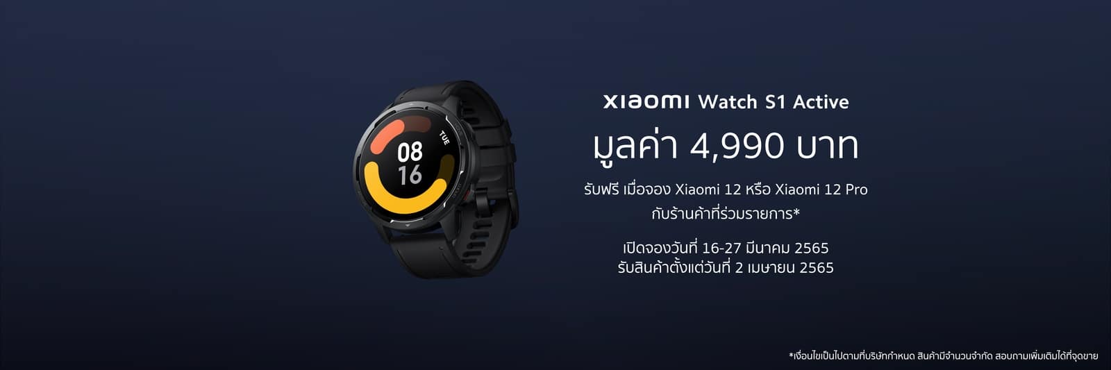 พิเศษ! สำหรับลูกค้าที่สั่งจอง Xiaomi 12 Pro หรือ Xiaomi 12 ในระหว่างวันที่ 16-27 มีนาคม 2565 รับฟรี** นาฬิกาอัจฉริยะ Xiaomi Watch S1 Active มูลค่า 4,990 บาท