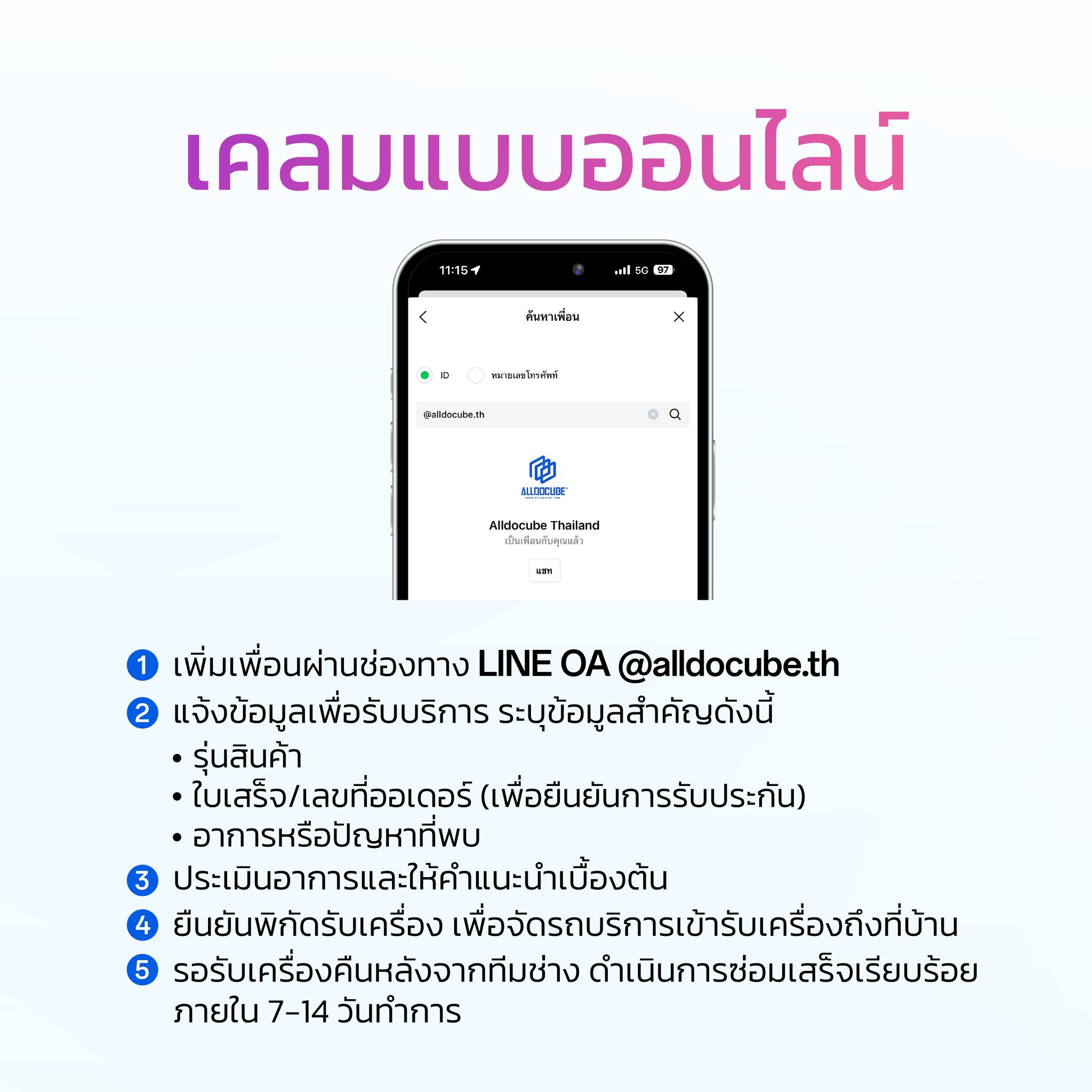 หรือส่งเคลมออนไลน์ผ่าน LINE @alldocube.th โดยใช้เวลาพิจารณาประมาณ 14 วัน