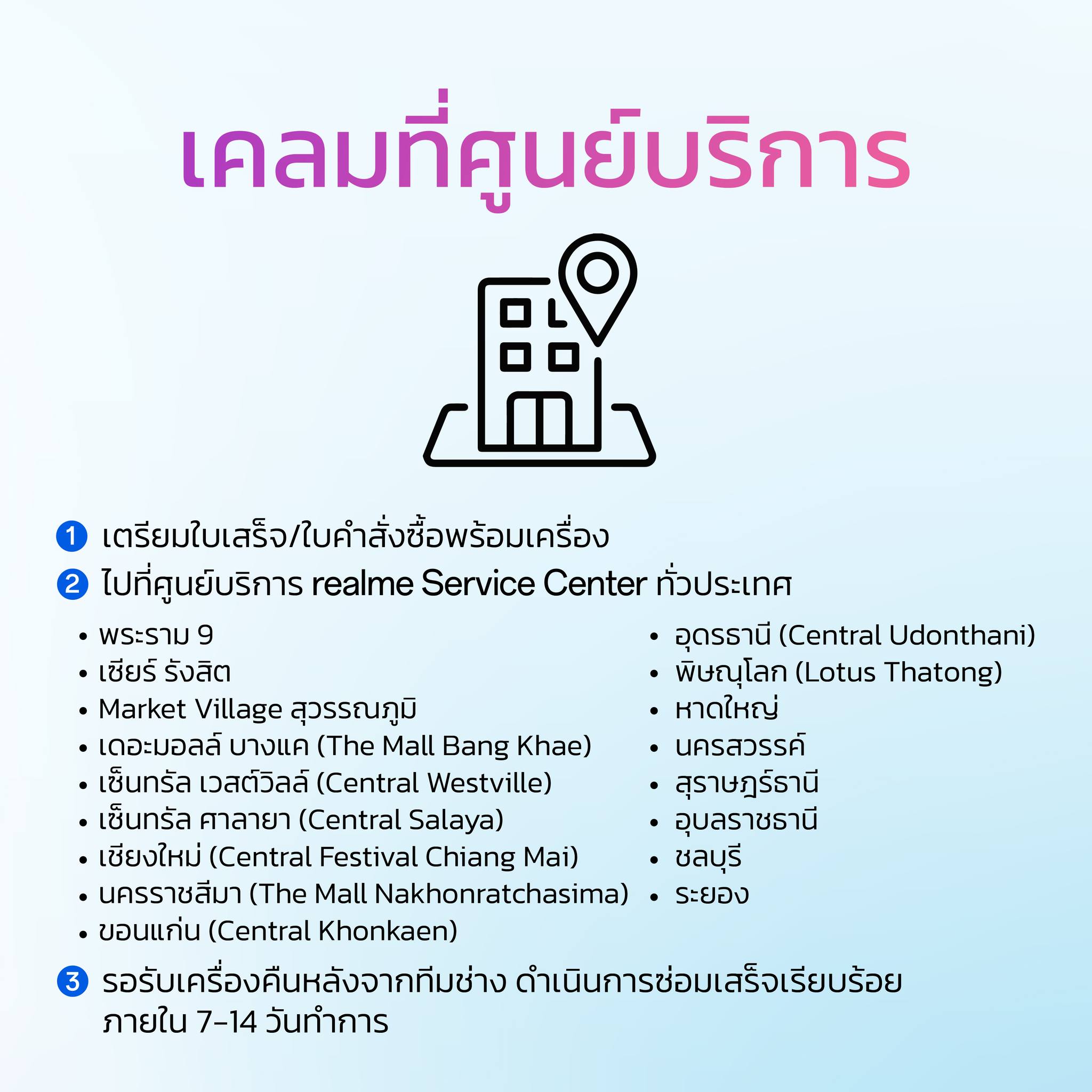 การรับประกัน 12 เดือน ส่งซ่อมฟรี ไม่มีค่าใช้จ่าย ส่งศูนย์ realme service 17 สาขาทั่วประเทศ