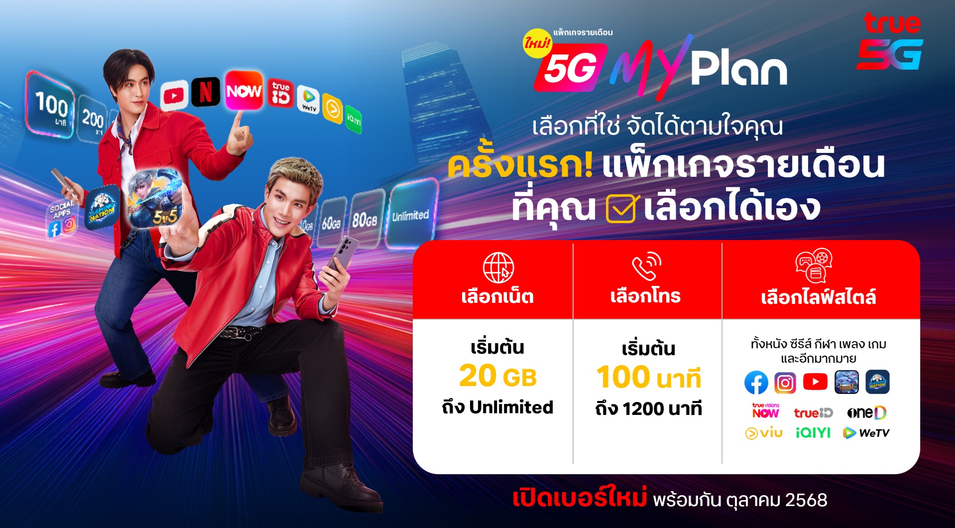 ทรู คอร์ปอเรชั่น ไม่อยู่นิ่ง เปิดตัวแคมเปญ “MyPlan” อยู่กับทรู เลือกได้ตามใจ พลิกโฉมแพ็กเกจรายเดือนรูปแบบใหม่ 5G MyPlan ครั้งแรกในไทยที่ให้ทุกเจนเลือกเองได้ตามใจ ทั้งเน็ต-โทร-ไลฟ์สไตล์ หลากหลายทั้งหนัง กีฬา เพลง คอนเทนต์ เกม และอีกมากมาย เริ่มต้นเพียง 399 บาทต่อเดือน พร้อมส่วนลดพิเศษสำหรับนักเรียน นักศึกษา และผู้ใหญ่ 55 ปีขึ้นไป และเพิ่มความเอ็กซ์คลูซีฟ ด้วย “YOU Club” คลับพิเศษเอาใจ Gen Z ที่รวมดีลจากกว่า 100 แบรนด์ดัง พร้อมกิจกรรมสุดฮอตโดยเฉพาะ พร้อมดึงคู่จิ้นขวัญใจ Gen Z GEMINI–FOURTH มาร่วมสะท้อนพลังคนรุ่นใหม่ ถ่ายทอดความเป็นตัวเองได้ในแบบที่อยากเป็น ย้ำภาพทรูในฐานะแบรนด์ที่เชื่อมต่อทุกความฝันและทุกไลฟ์สไตล์บนเครือข่าย 5G ที่ดีที่สุดของไทย